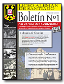 Boletín Nº 4 del año 2010 Ponemos a disposición de todos los exalumnos, los detalles de las Celebraciones del Centenario del Liceo Alemán de Santiago en el Mes de Octubre, entre las que se cuentan el "Acto de Conmemoración del Centenario del Liceo Alemán en el Teatro de la Escuela Militar" y la "Misa de Acción de Gracias en la Catedral Metropolitana de Santiago Boletín Nº 4 - 2010 5.35 MB